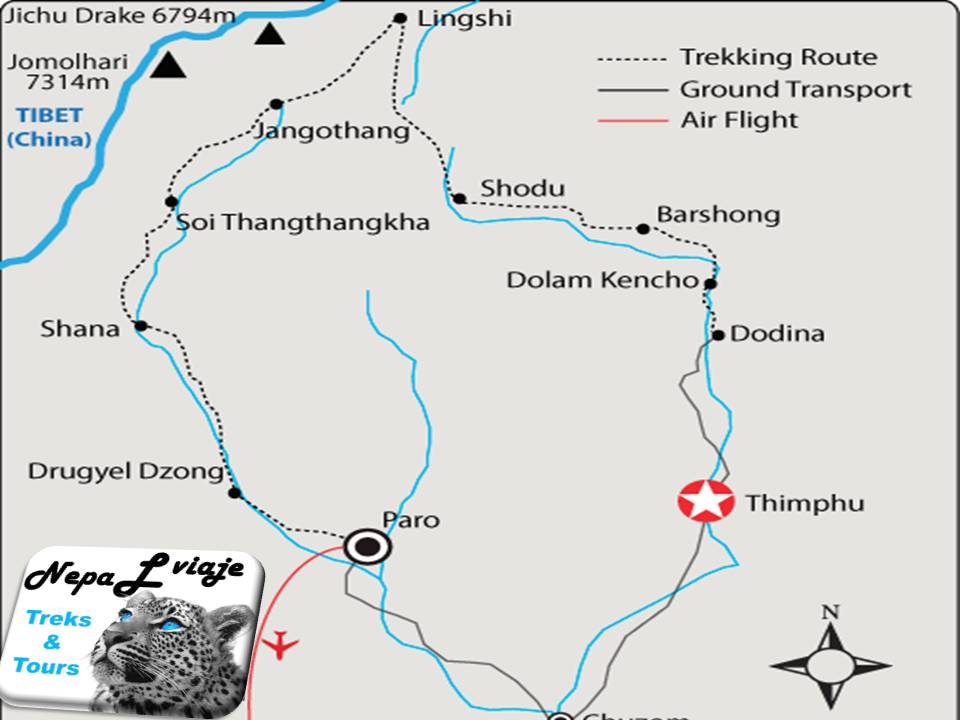 El sendero sigue la corriente durante media hora y cruza el puente hacia el lado derecho, iniciando la subida a la cresta con una vista impresionante de Jumolhari, JichuDrakey y Ghang Tsrim. Luego, caminamos hacia el valle, casi plano por un tiempo, hasta la subida al paso de Nyeley a una altitud de 4.700metros. Después del paso es un descenso gradual hasta el campamento Lingshi, disfrutando de la vista panorámica de los picos y dzong Lingshi. Campamento de altitud a 4.000 metros. Tiempo de recorrido de 7-8 horas. Noche en campamento/lodge